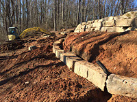 Boulder terrace walls topped with split rail fence and stone steps with locust handrails