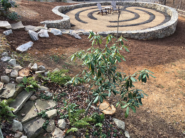 Stone steps leading to a small walking labyrinth contained by a masonry stone wall