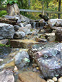 Two tiered fish pond accented with dwarf ornamental trees and perennials
